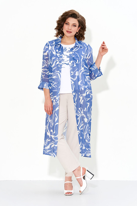 Костюм женский с брюками, футболкой и удлиненной рубашкой из шифона. Рубашка прямого силуэта со втачными рукавами и разрезами по бокам, застежка-планка на петли и пуговицы. Базовая трикотажная футболка полуприлегающего силуэта с небольшими втачными рукавами и декоративной печатью. Футболка прошла тестовую стирку при температуре 30 градусов: печать не линяет и не тяет цвет. Брюки полуприлегающего силуэта заужены к низу, притачной пояс  на резинке по бокам, застежка на молнию, петлю и пуговицу, в боковых швах карманы.  Уход за изделиями из шифона:
