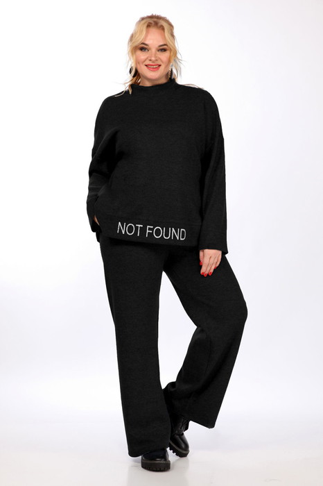 Комплект брючный 2-х предметный изготовлен из трикотажного полотна. Джемпер свободного силуэта, горловина обработана воротником – стойка. Низ переда с широкой планкой, декорированной печатью. Спинка цельнокроенная. В боковых швах обработаны карманы. Рукав спущенный, длинный. Брюки средней посадки, пояс на резинке дополнен шнуром. Брюки прямого покроя.