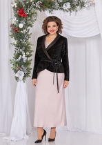 Комплект брючный, состоит из туники и брюк. Туника свободного силуэта из костюмно — плательной ткани. Горловина V — образной формы. По низу рукава и горловине вставлен довяз. Рукава — цельнокроеные. В боковых швах внизу блузы обработаны разрезы. Брюки средней посадки, прямые. Пояс на резинке обработаны боковые карманы. Декор — печать по низу туники.