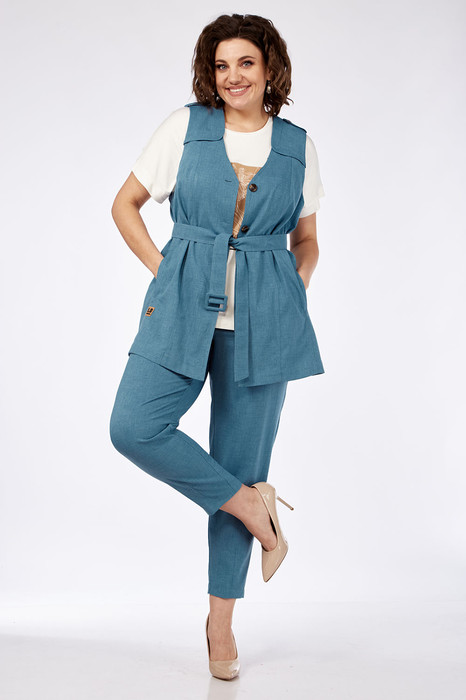 Комплект брючный 3-х предметный состоит из жилета, брюк и джемпера. Жилет из костюмно-плательной ткани прямого силуэта. Горловина V-образной формы. По переду фигурные кокетки, рельефные швы.  Застежка центрально — бортовая на петли и пуговицы. Спинка разрезная с кокеткой. По боковым швам разрезы. На плечевых швах паты с пуговицей. Брюки средней посадки, заужены к низу. По переду боковые карманы с подрезным бочком. По задним деталям накладные карманы. Пояс в 58-62 размере частично на резинке. Джемпер из трикотажного полотна. Рукав спущенный. По переду печать.
