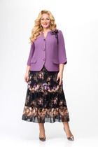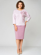 Костюм женский 2х — предметный выполнен из ажурного трикотажного полотна. Состоит из джемпера и юбки. Джемпер свободного силуэта горловина V-образной формы. По переду накладной карман. В боковых швах разрезы. Рукава спущенные, к низу обработана кулиса с декоративной тесьмой. Низ джемпера с перепадом длины. Юбка зауженная к низу, пояс цельнокроеный на резинке. Юбка на подкладке.