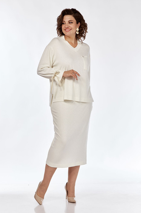 Костюм женский  2х — предметный выполнен из ажурного трикотажного полотна. Состоит из джемпера и юбки. Джемпер свободного силуэта горловина V-образной формы. По переду накладной карман. В боковых швах разрезы. Рукава спущенные, к низу обработана кулиса с декоративной тесьмой. Низ джемпера с перепадом длины. Юбка зауженная к низу, пояс цельнокроеный на резинке. Юбка на подкладке.