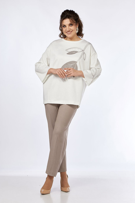 Комплект брючный 2х — предметный состоит из джемпера и брюк. Джемпер свободного силуэта выполнен из трикотажного полотна, горловина обработана бейкой, перед и спинка цельнокроеные. Рукава спущенные. Джемпер дополнен дизайнерской вышивкой по переду и рукаву. Брюки выполнены из костюмной ткани средней посадки, заужены к низу. Пояс притачной со вставками с эластичной тесьмой. Застежка на молнию и петлю с пуговицей. По переду обработаны карманы с подрезным бочком. В брюках заутюжены стрелки.