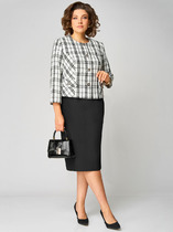 Костюм женский 2х-предметный, состоит из жакета и юбки, выполнен из хлопковой костюмной ткани. Жакет прямого силуэта, с центральной бортовой застежкой на петли и джинсовые пуговицы. Горловина округлой формы с отрезной обтачкой. По переду обработаны рельефы и накладные детали фигурной формы, в которых выполнены карманы. На спинке обработаны рельефы и кокетка. Рукава спущенные, с широкой подгибкой низа. Изделие дополнено по спинке дизайнерской вышивкой. Юбка прямого силуэта с притачным поясом, с застежкой на петлю с пуговицей и молнию. Передние и задние детали юбки разрезные. По переду обработаны боковые карманы.