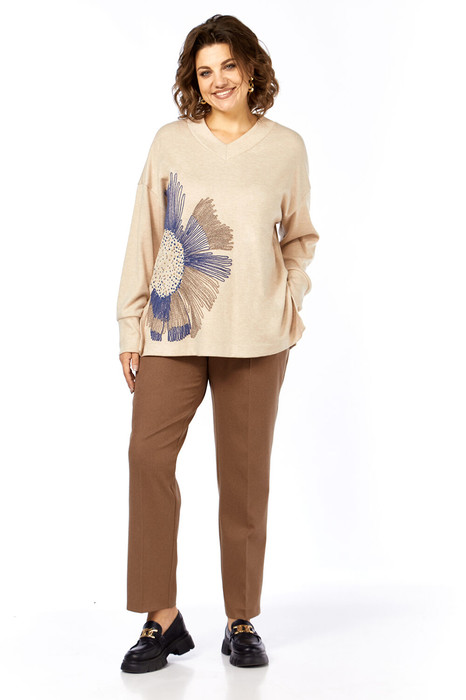 Комплект женский брючный, состоит из джемпера и брюк. Джемпер свободного кроя, изготовлен из трикотажного полотна. Горловина V-образной формы. На полочке-вышивка. Спинка цельнокроенная. Рукава спущенные, с манжетами по низу. В боковых швах-разрезы. Брюки классические из костюмной ткани. В брюках обработан пояс, частично на резинке. Застежка на молнию, петлю и пуговицу. В брюках обработаны боковые карманы. Сзади обработана кокетка.