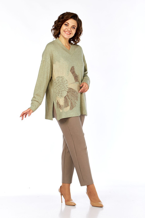 Комплект женский брючный, состоит из джемпера и брюк. Джемпер свободного кроя, изготовлен из трикотажного полотна. Горловина V-образной формы. На полочке-вышивка. Спинка цельнокроенная. Рукава спущенные, с манжетами по низу. В боковых швах-разрезы. Брюки классические из костюмной ткани. В брюках обработан пояс, частично на резинке. Застежка на молнию, петлю и пуговицу. В брюках обработаны боковые карманы. Сзади обработана кокетка.