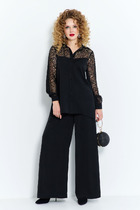 "Комплект брючный 2-х предметный, состоит из джемпера и брюк. Джемпер свободного силуэта, выполнен из трикотажного полотна. Горловина обработана бейкой. Перед разрезной по центру с боковыми рельефами. Швы отстрочены декоративным швом. Спинка цельнокроеная. Рукава спущенные с широкой подгибкой низа. В боковых швах обработаны разрезы. Джемпер декорирован дизайнерской вышивкой. Брюки свободного силуэта, выполнены из трикотажного полотна. Пояс притачной, на эластичной тесьме. По передним деталям брюк обработаны карманы с подрезным бочком. На задних деталях брюк имеются накладные карманы.