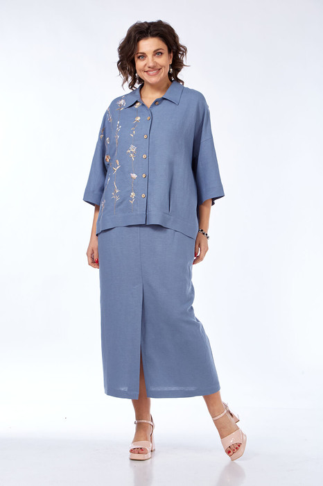 Костюм женский 2х-предметный, состоит из блузки и юбки, выполнен из натуральной ткани белорусского производства. Блузка свободного силуэта с воротником рубашечного типа и центральной застежкой на петли с пуговицами. Низ переда обработан притачной планкой. На спинке кокетка и складки. Рукава спущенные с отложными манжетами. Блузка декорирована вышивкой. Юбка прямого силуэта с притачным поясом, частично на эластичной тесьме. По переду обработаны боковые карманы, в центральном шве переда имеется шлица. Юбка на подкладке.