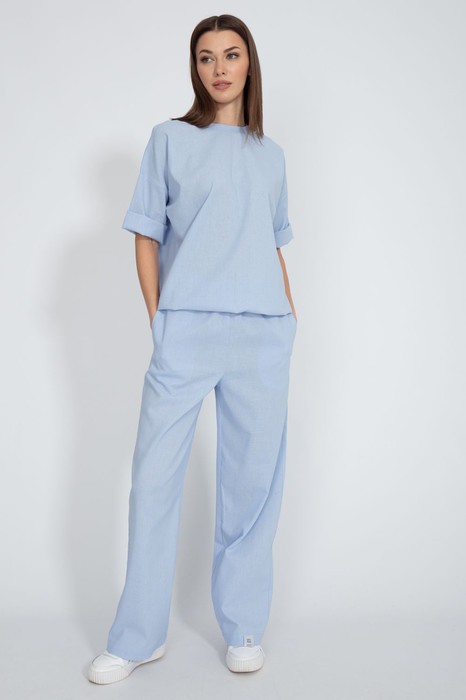 Костюм состоящий из брюк прямого свободного кроя с карманами в боковых швах и джемпера свободного кроя. С приспущенным рукавом и кулиской по низу изделия с возможностью регулировки ширины низа.  Ткань лен. Отлично сочетается с шортами модели 4074, рубашкой 4073, рубашкой 4081, джоггерами 4082.