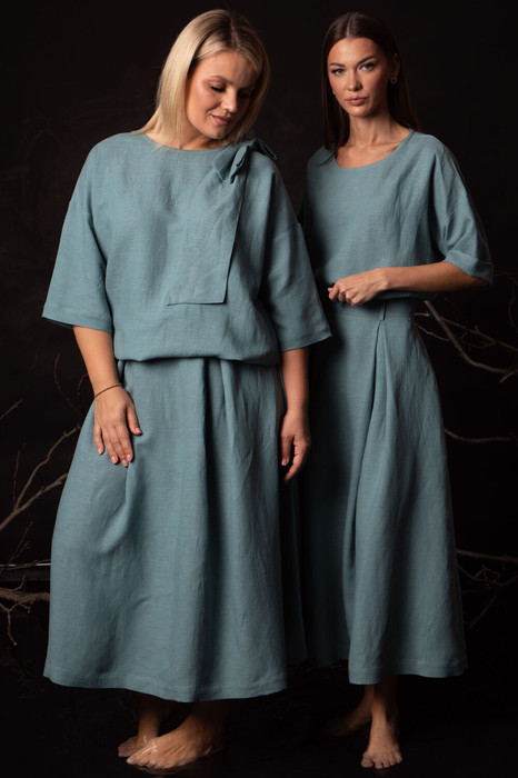 Элегантный костюм премиум-класса из белорусского льна с вискозой премиального качества — идеальный баланс романтики, практичности и экологичности. Набор включает джемпер свободного прямого кроя со съемным декоративным бантом и длинную юбку с эффектными встречными складками, боковыми карманами и потайной молнией. Натуральные материалы обеспечивают легкость, воздухопроницаемость и гипоаллергенность, сохраняя безупречный вид в любых ситуациях.