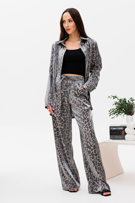 Трендовый комплект в леопардовый принт. Комплект состоит из блузки прямого кроя с длинным рукавом и широких брюк на резинке. Блузка с застежкой по переду на золотые пуговицы. Брюки с карманом по переду, поясом на резинке и с шнурочком, для регулировки по талии. Этот комплект можно надеть с босоножками на каблуках и пойти на вечеринку, а можно носить в повседневной жизни дома, на даче или маме в декрете на прогулке. Длина блузки 75 см. Длина брюк 113 см.