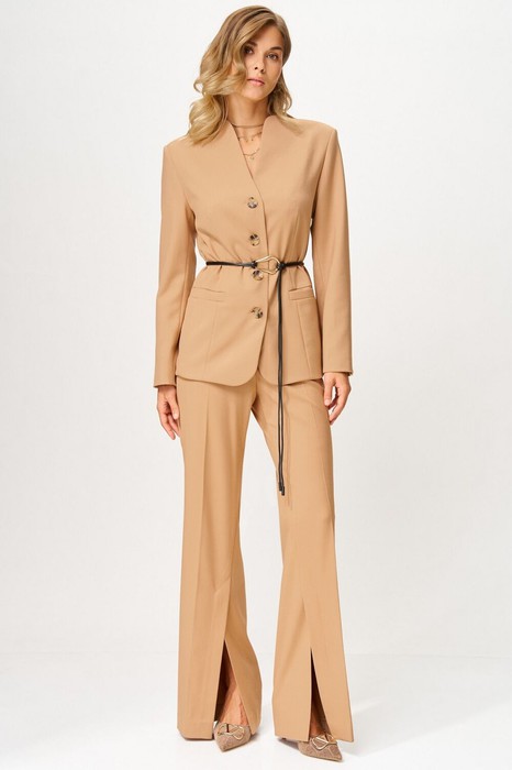 Жакет полуприлегающего силуэта с центральной застежкой на 4 петли и 4 пуговицы. Вырез горловины жакета фигурной формы. Детали переда жакета с отрезными бочками и вертикальными нагрудными вытачками. Карманы горизонтальные прорезные с листочками с втачными концами. Деталь спинки жакета со средним швом, отрезными бочками и рельефными швами. Рукава втачные двухшовные, по локтевым швам вставлена планка, по низу декоративно прикреплены по 4 пуговицы. Жакет с притачной понизу подкладкой. Съемный пояс в комплекте.