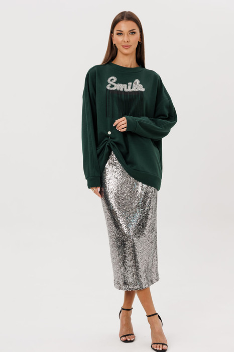 Блузон-бомбер прямого свободного силуэта oversize со спущенной линией плеча. Рукав трехшовный, оканчивается манжетой, шириной 5,5 см. По центру линии плеча, рукава, вставлены лампасы из основного трикотажного полотна шириной 4 см. Горловина имеет округлый вырез, обработана планкой по косой шириной 3 см. Низ изделия обработан планкой-манжетой, высотой 6,5 см. На фронтальной части переда расположен декоративный элемент: тесьма вытянутой прямоугольной формы и эффектная термоаппликация со стразами и нитями бисера. Длина изделия свитшота по центральной линии спинки 70-72 см (в зависимости от размерного ряда).