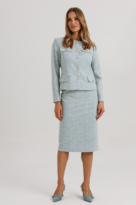 Классический комплект в стиле «Шанель», состоящий из жакета и юбки прилегающего силуэта на подкладке.