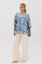 Брюки комплекта созданы в свободном стиле. В пояс брюк по спинке вставлена эластичная тесьма, шириной 3 см. Спереди пояс фиксируется горизонтально на петли/пуговицы и вертикалную закрытую клапан-молнию (гульфик).