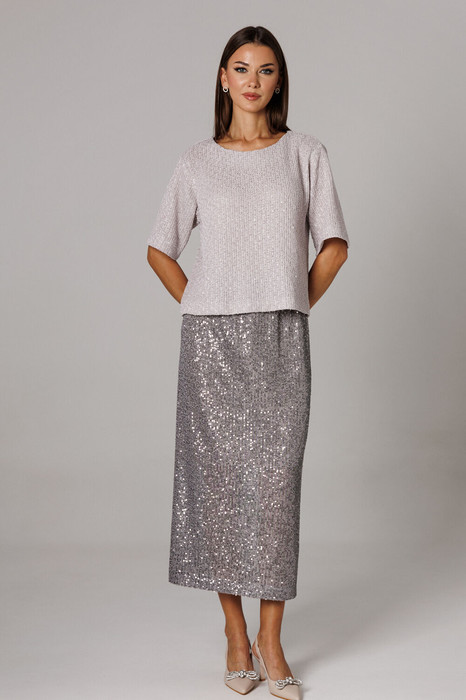 Юбка из трикотажного полотна с пайетками, прямого свободного силуэта, на трикотажной подкладке. Линия талии оформлена притачным поясом на эластичной тесьме. Длина юбки по среднему шву спинки 78 см.