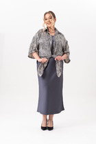 Блуза прямого свободного силуэта с рубашечным воротником на стойке и зауженным рукавом на манжете со спущенной линией плеча. Спереди на функциональной планке петли/пуговицы. Спинка изделия имеет горизонтальную плечевую кокетку (высота кокетки 20 см) и встречную складку для свободы движения. По плечевому шву заложена складка. Низ блузона слегка фигурный: спинка и полочка чуть длиннее бокового шва. Длина изделия блузона по спинке 73 см. Рукав рубашечный одношовный завершается манжетой (высота 5 см) с застежкой петля/пуговица. Длина спущенного плечевого шва 33 см. Длина рукава с манжетой 41 см.