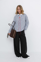 Декоративным элементом блузона выступает контрастный рисунок, напоминающий элементы лепестков цветочного узора. Расположены эти элементы асимметрично, на одном из рукавов, также полочке и частично в боковом сегменте спинки блузона. Рисунок создан трикотажным кантом. Горловина оформлена угловым вырезом на полочке и оформлена притачным обтачным элементом. Низ блузона оканчивается притачной манжетой, высотой 7,5 см. Длина блузона по спинке изделия 61 см.