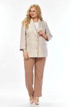 Брюки комплекта созданы в свободном стиле. Силуэт брюк к низу изделия имеет расклешение. В пояс брюк по спинке вставлена эластичная тесьма, шириной 3 см. Спереди пояс фиксируется горизонтально на петли/пуговицы и вертикальную закрытую клапан-молнию (гульфик). При желании в пояс можно вставить ремень, так как имеются шлевочные держатели. В боковых швах: карманы с наклонным входом, на поясной линии талии переда расположена неглубокая складка для свободы движения, на задних полотнищах линии талии-вытачки. Длина брюк по боковому шву 108 см (без учета высоты пояса).