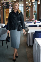 Шикарный комплект классических тонов черного и белого, состоящий из свободной блузы рубашечного кроя с вертикальной рюшей и современных брюк.