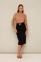 Брюки комплекта созданы в свободном стиле палаццо. В пояс брюк по спинке вставлена эластичная тесьма, шириной 3 см. Спереди пояс фиксируется горизонтально на петли/пуговицы и вертикалную закрытую клапан-молнию (гульфик).