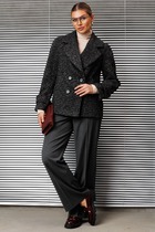 Комплект, состоящий из жакета и юбки. Жакет полуприлегающего силуэта на подкладке с рельефами по переду и спинке, с отрезным поясом по талии и накладными карманами с клапаном. Рукав втачной двухшовный длинный, воротник стояче-отложной. Застежка центральная бортовая на обтяжные пуговицы. Юбка на подкладке, зауженная к низу с притачным поясом и на резинке в размерах 50-60. Застежка в юбке на потайную тесьму-молнию в среднем шве заднего полотнища и шлицей.