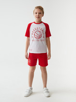 Костюм из кулирки для мальчиков футболка + шорты. Красная футболка с округлой окантованной в тон горловиной, на полочке принт в виде юного летчика, короткие рукава. Шорты с карманами по бокам, пояс на резинке, тематический узор, длина приблизительно до коленей. Размеры от 26 до 40. Есть возможность розничного заказа.