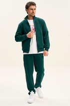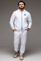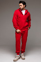 Костюм мужской кофта и брюки. Кофта с длинным втачным рукавом. Горловина округлой формы, обработанная узким воротником. На полочке изделия принт. Низ рукава и изделия - подгибка декоративно-отделочной строчкой. Брюки прямого силуэта с притачным поясом, карманами "хулиган". Низ изделия - подгибка.
