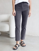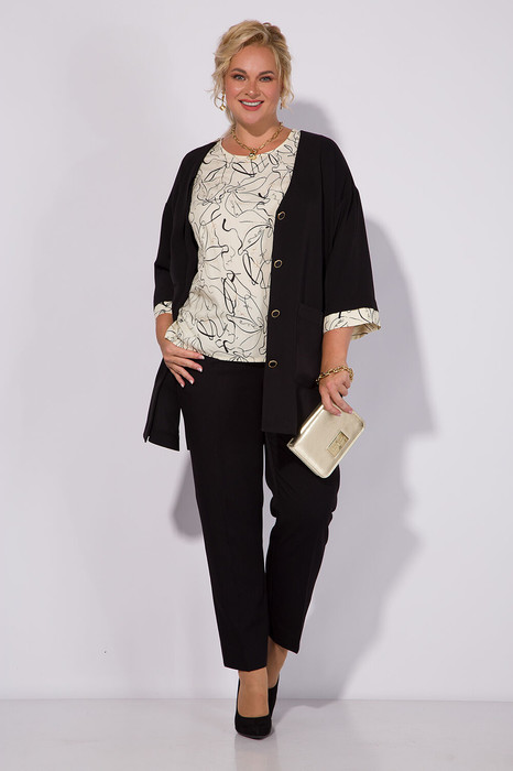 Классические женские брюки в комплекте, со средней посадкой, прямого покроя от бедра. Застежка – брючная тесьма-молния с обработанным гульфиком. Карманы боковые. Пояс притачной, в боковых участках вставлена резинка на свободу. По переду заутюжены канты. Спинка с Талиевыми выточками. Подгибка брюк –– 4 см.