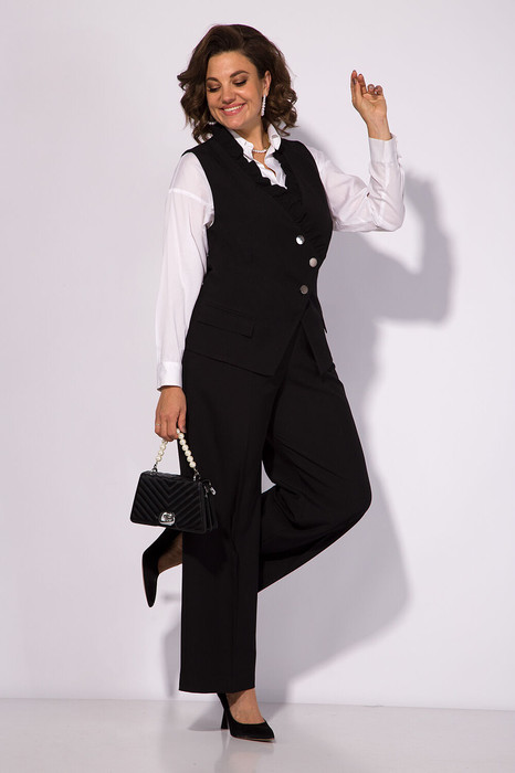 Эффектный офисный костюм, состоящий из брюк и жилетки. Оригинальная жилетка на шелковой подкладке, с ассиметричной застежкой на пуговицы. Вырез горловины v-образной формы с рюшей из основной ткани. Жилетка с прорезными карманами с клапаном. Спинка приталенная. Брюки прямого кроя, на притачном поясе. Застежка - брючная тесьма-молния с обработанным гульфиком. В боковых участках пояса вставлена резинка для более комфортного прилегания. В брюках заутюжены канты. Такой костюм можно носить в комплекте или раздельно, дополнить блузкой для деловой встречи или футболкой для модной вечеринки. В таком костюме вы всегда будете чувствовать себя превосходно!