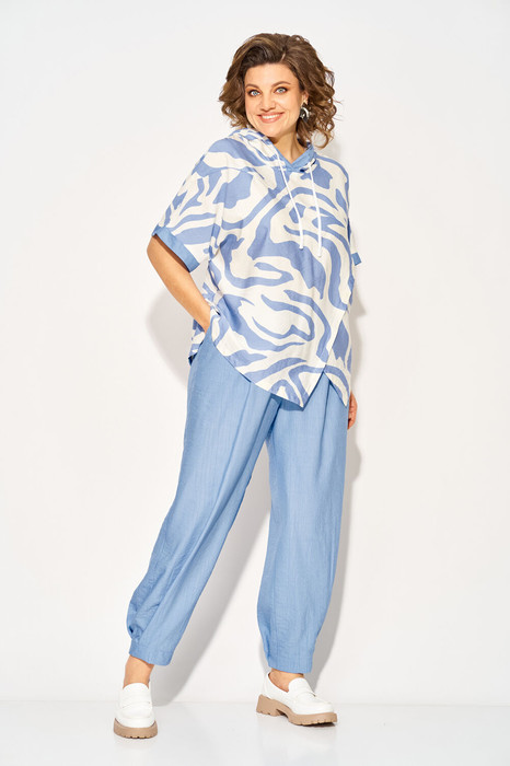 Стильный летний костюм, состоящий из удлиненной туники свободного покроя и брюк. Оригинальная туника из вискозы добавлением льна. Модель с цельнокроеным укороченным рукавом и ассиметричным подрезом по полочке. Модель с легким капюшоном и кулисой на шнуровке. Низ изделия разноуровневый. Спинка цельная. В комплекте свободные брючки, завышенной посадки. Брюки на притачном поясе с круговой резинкой. Имеются боковые карманы. Низ с заложенными складками, что придает изделию более спортивный образ.