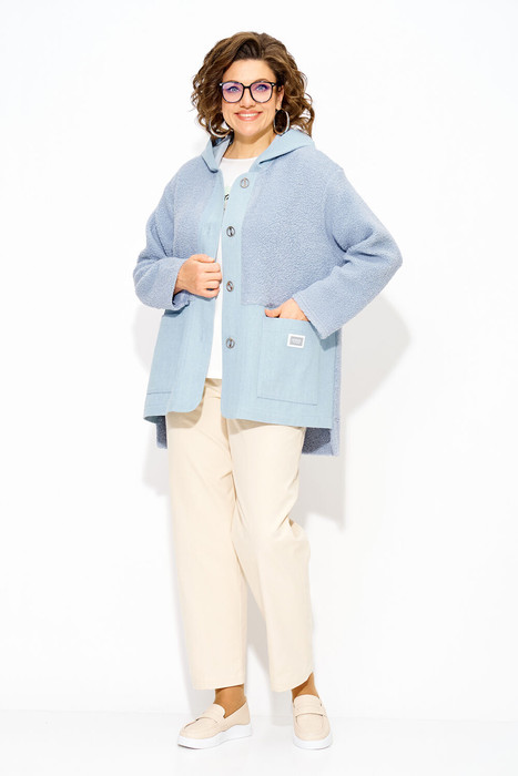 Женский джинсовый жакет- ветровка больших размеров с капюшоном — это стильный и универсальный элемент гардероба, который идеально подходит для создания модных образов в любое время года. Комбинированный джинсовый жакет-ветровка с капюшоном, выполнен из 100% хлопка с добавлением трикотажа с меховым эффектом «Тэдди».  Модель свободного силуэта, с длинным рукавом на спущенном плече. Застежка центральная, на петли и пуговицы на декоративную планку. По полочке расположены накладные карманы. Удобный объемный капюшон защитит вас от ветра и холода в непогоду.