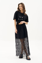 Жакет прямого силуэта. Воротник пиджачного типа. Передние половинки жакета с нагрудными вытачками и центральной застёжкой на петли и пуговицы. В боковых швах небольшие разрезы. Рукав втачной одно-шовный. Брюки свободного кроя, прямые. Передние половинки брюк с двумя складками по переду и застёжкой по типу «гульфик». Верхний срез брюк обработан притачным поясом, по бокам вставлена резинка. В боковых швах карманы «хулиганы».
