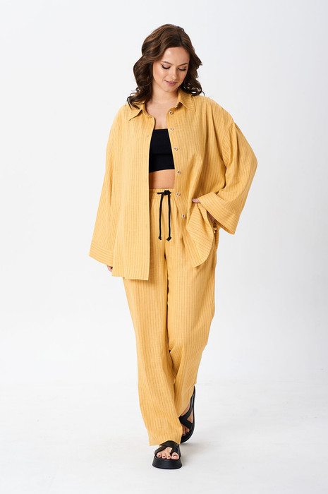 Рубашка «оверсайз» со спущенной линией плеча, с отложным рубашечным воротником на стойке, застежка центральная на петли и пуговицы. По переду от плечевого шва рельефы. Спинка с отрезной кокеткой и бантовой складкой. Рукав прямой, низ рукава на притачной манжете. Брюки свободного кроя, на притачном поясе с эластичной тесьмой и декоративным шнуром. В боковых швах карманы “ хулиганы”.