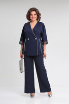 Блузка полуприталенного силуэта с отрезной баской по переду по линии талии. Перед с нагрудными и таллиевыми вытачками. Спинка с таллиевыми вытачками и средним швом в который вставлена потайная молния. Горловина округлой формы обработана обтачкой. Рукав втачной с манжетой, с застёжкой на одну пуговицу. Блуза со съёмным поясом. Брюки к низу заужены, верхний срез брюк на притачном поясе, по бокам брюк вставлена эластичная тесьма, имеются шлёвки под ремень. Застежка спереди по типу «гульфик», боковые карманы с наклонным входом. На передних половинках небольшая складка, переходящая в стрелку.