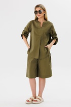 Капсульный брючный комплект с прямыми брюками и блузки подойдет для особых случаев и офисных будней. Многофункциональный комплект легко сочетать с другими вещами создавая стильные и современные образы , подходит для шпилек и обуви на плоском ходу. Стильная блузка прямого силуэта с легким приталиванием и округлым вырезом с v-образной каплей по центру, горловина и капля оформлены узкой контрастной бейкой. Низ блузки оформлен фигурной линией. Перед с нагрудными вытачками, спинка цельная. Спинка с талиевыми вытачками. Рукава втачные обработаны бейкой с разрезами и декоративными пуговками, линия плеча приспущена. Трендовые прямые брюки со стрелками и отрезным поясом на резинке must-have для современной женщины. Застежка обработана по классической технологии (гульфик с молнией и пуговица на поясе).