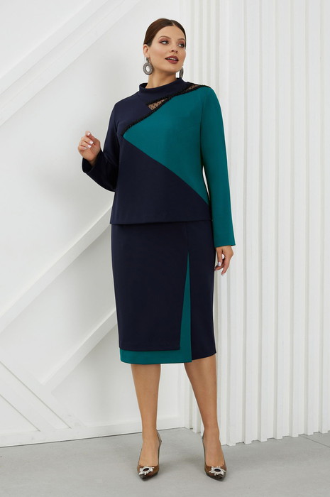 Джемпер с воротником стойкой. Перед с дизайнерскими отрезными деталями и с декоративной тесьмой и сеткой в верхней части. Спинка с талиевыми вытачками. Рукава втачные.