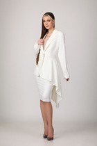 Жилет с фигурным вырезом горловины и ассиметричной застёжкой на петли и пуговицы. От борта с одной стороны на уровне талии расположен пояс, который застёгивается на петлю с пуговицей на спинке. Спинка со складкой по центру.