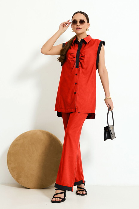 Дизайнерский комплект, состоящий из брюк и блузы без рукава. Удлиненная  блуза  прямого  силуэта  с боковыми разрезами. Застежка центральная с петлями и пуговицами. Воротник рубашечный, по борту отрезная планка из отделочной ткани и сборкой. Перед с планками-рукавами из отделочной ткани и боковой детали чтобы не было видно белья. Прямые брюки  с отрезным поясом, с  резинкой   по бокам. Карман с боковой частью и планкой из отделочной ткани. В низу передней части брюк манжета из отделочной ткани. Застежка обработана по классической   технологии  (гульфик с молнией и пуговица на поясе).  Модель прекрасно подойдет для офиса и вечерних прогулок.