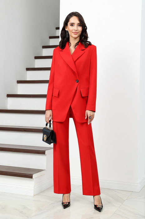 Жакет со стояче-отложным воротником пиджачного типа и смещённой застёжкой на петлю с пуговицей. Перед с карманами с клапанами в нижней части. Спинка с двумя рельефами и шлицей с пуговицами с одной стороны. Рукава втачные со шлицей с пуговицами по низу. Изделие на подкладке.