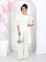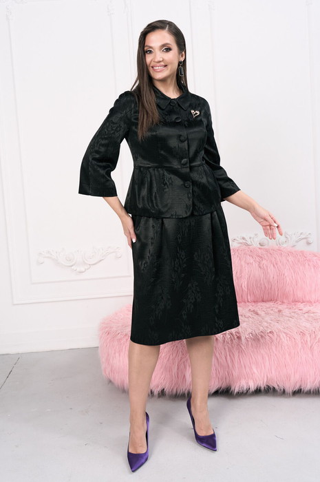 Жакет с центральной застёжкой на петли и пуговицы, отрезной баской и стояче-отложным воротником. Баска со складками по переду и спинке. Спинка со средним швом и двумя рельефами. Рукава цельнокроеные с изделием по переду и втачные по спинке. Жакет на подкладке. Изделие с брошью в верхней части (брошь входит в комплект).