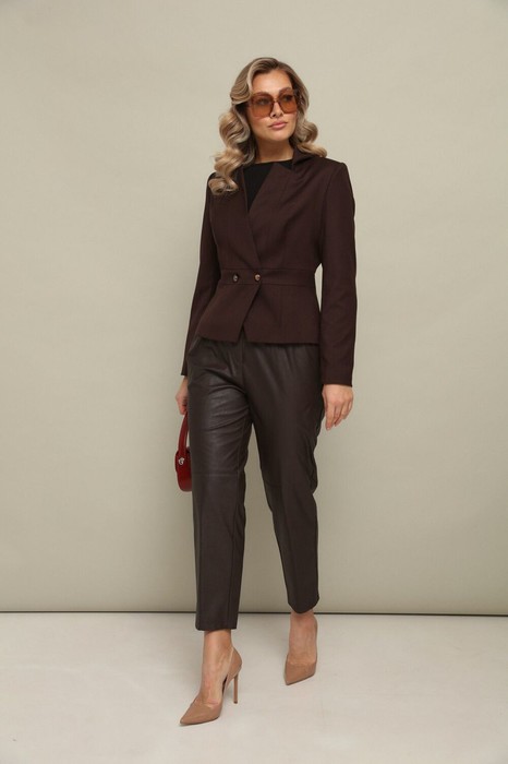 Комлект 2ка состоит из жакета и брюк. Укороченный двубортный приталенный жакет с застёжкой на пуговицы. Воротник - стойка с фигурным вырезом. Длина изделия по спинке 58-60 см.  Зауженные брюки из экокожи. Пояс на эластичной тесьме и втянутым шнурком. Вход в карман фигурный, наклонный к боковому шву.