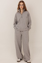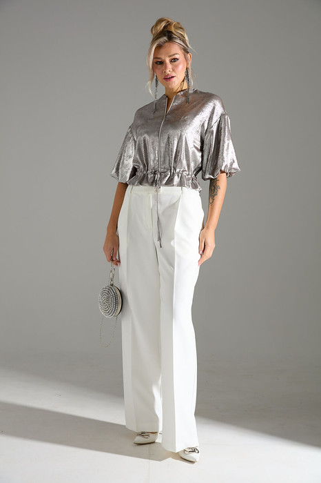 Комплект 2-ка, состоящий из укороченной блузы и брюк. Блуза с застёжкой на молнию и объёмными рукавами. Линия талии на кулисе и завязке из основной ткани. Брюки широкого объема, прямого силуэта. На передних половинках брюк заутюжены стрелки, переходящие в складки по линии талии. На задних половинках также заутюжены стрелки. В боковых швах расположены карманы. Застежка-гульфик. Пояс отрезной, притачной. В задней части пояса вставлена эластичная тесьма (резинка). На пояс настрочены шлевки. Выступающая часть пояса застегивается на петлю и крючок.