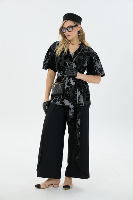 Комплект 2ка, состоящий из жакета и брюк. Жакет на подкладке с объёмными рукавами. Перед выполнен на запах с застежкой на кнопки, под пояс по талии. Широкие брюки-кюлоты свободного оригинального кроя с застёжкой на пуговицы. Без карманов.