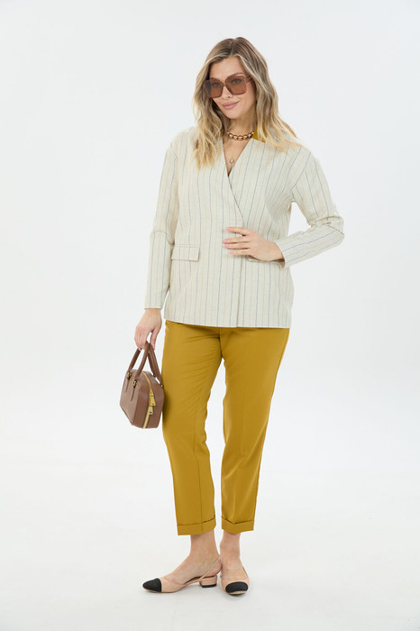 Комплект 2ка,состоящий из жакета и брюк. Жакет двубортный свободного обёма без воротника с застёжкой на кнопки. По переду расположены карманы с клапаном. Брюки свободного прилегания по бедрам и зауженные к низу. Пояс на эластичной тесьме с кулисой и втянутым шнурком. Вход в карман фигурный, наклонный к боковому шву.