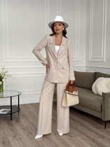 Костюм 2ка, состоящий из кардигана и брюк. Кардиган без подкладки прямого силуэта с шалевым отложным воротником. По низу рукава отделка из кружева. По переду расположены нагрудные вытачки. В комплекте пояс из основной ткани. Брюки умеренного объема, прямого силуэта. Застежка-гульфик. Пояс отрезной, притачной. В задней части пояса вставлена эластичная тесьма (резинка). Выступающая часть пояса застегивается на петлю и крючок. Рост фотомодели 175 см. Размер у фотомодели – 44.
