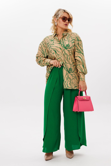 Комплект 2-ка, состоящий из рубашка и брюк. Рубашка женская большого объема, прямого силуэта. На детали спинки расположена двойная кокетка, переходящая на деталь полочки. Под кокеткой на спинке встречная складка. Воротник рубашечный отложной на стойке. Застежка планка центральная на прорезные петли и пуговицы. Линия плеча спущенная, рукав рубашечный, длинный. В нижней части рукава заложены складки, заканчивается манжетой с двумя прорезными петлями и пуговицами. Низ блузки разноуровневый: спереди короче, сзади длиннее. Широкие брюки-кюлоты свободного оригинального кроя с застёжкой на пуговицы. Без карманов.