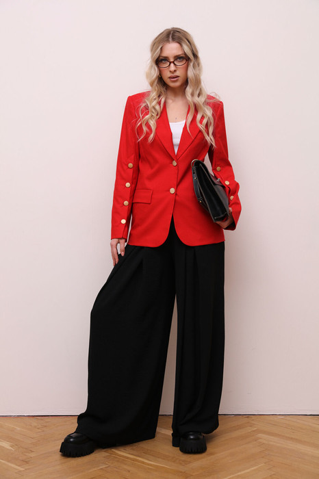 Комплект 2ка, состоящий из жакет и брюк. Яркий однобортный жакет приталенного силуэта с застёжкой на 2 пуговицы.  По бокам расположены функциональные прорезные карманы с клапанами.  Жакет на подкладке. На рукавах жакета выполнены функциональные застёжки на петли и пуговицы. Брюки широкого объема. По центру переда заложены две широкие встречные складки на каждой половинке. В боковых швах расположены карманы с наклонным входом. Талия на резинке. Ткань струящаяся и не мнется.