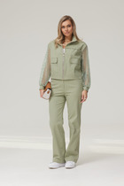 Комплект 2-ка, состоящий из рубашки и брюк. Брюки широкого объема, прямого силуэта. На передних половинках брюк заутюжены стрелки, переходящие в складки по линии талии. На задних половинках также заутюжены стрелки. В боковых швах расположены карманы. Застежка-гульфик. Пояс отрезной, притачной. В задней части пояса вставлена эластичная тесьма (резинка). На пояс настрочены шлевки. Выступающая часть пояса застегивается на петлю и крючок. Рубашка-бомбер из лёгкой льняной ткани с застёжкой на петли-пуговицы. Низ рубашки и манжеты выполнены из довязов. Длина по спинке 60-63 см.