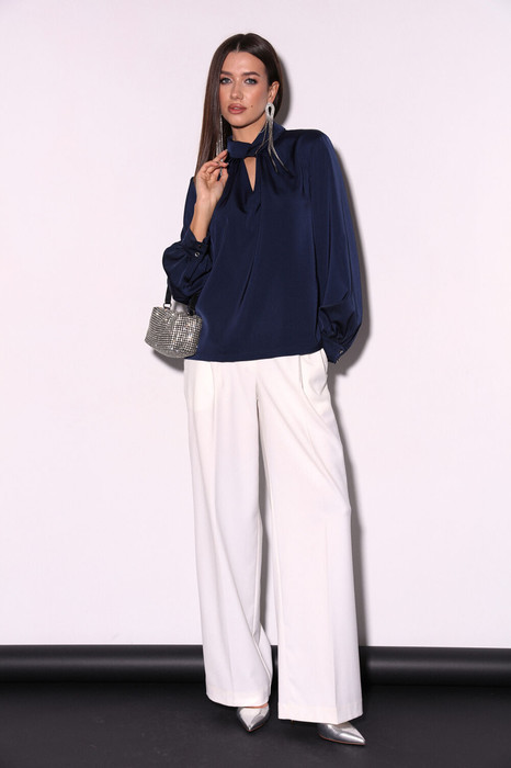 Комплект 2ка, состоящий из блузки и брюк. Блуза из плотной струящейся ткани с атласным эффектом объёмного кроя с воротником-стойкой и сборкой по горловине. Манжеты с застёжкой на две пуговицы, легкая сборка по низу рукавов. Брюки широкого объема, прямого силуэта. На передних половинках брюк заутюжены стрелки, переходящие в складки по линии талии. На задних половинках также заутюжены стрелки. В боковых швах расположены карманы. Застежка-гульфик. Пояс отрезной, притачной. В задней части пояса вставлена эластичная тесьма (резинка). На пояс настрочены шлевки. Выступающая часть пояса застегивается на петлю и крючок.